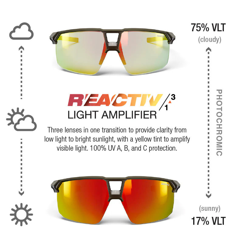 LIRY sunglasses are built for athletes who demand clarity, comfort, and confidence at speed. Equipped with REACTIV photochromic lenses, they automatically adapt to changing light conditions, delivering sharp vision from low light to full sun without interruption.