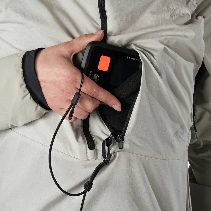 - An internal elastic sleeve and webbing loop inside the chest pocket let you securely hold your beacon, phone, or other essentials. The pocket aligns perfectly with the pass-through pocket on the TourTech Shell for quick access. The beacon pocket is also where the hybrid hoodie packs itself into for the most compressed carry in your pack.